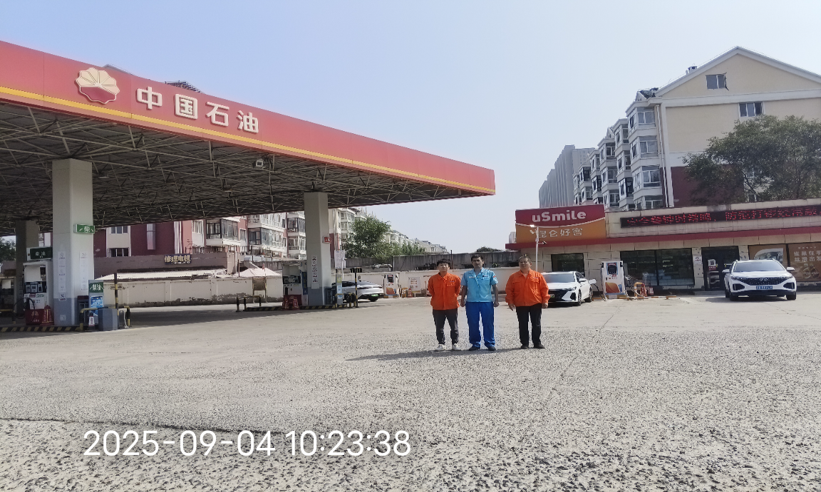 2025年9月4日赴南京路加油站进行现场查勘。本项目改造对原加油站布局不改变,站房、罩棚均不改变,储油区、加油区不改变,罐区改造原有1座汽油罐为甲醇储罐;拆除J04加油机在其加油机位新增1台双枪甲醇加注机(醇气回收型);甲醇加注机位于出口侧。针对改造的甲醇储罐及新增加注机与周边间距进行了测量,并对对增设甲醇加注业务改造项目的周边环境、总平面布置、安全管理、消防、工艺装置、公用工程及辅助设施等进行检查。 |