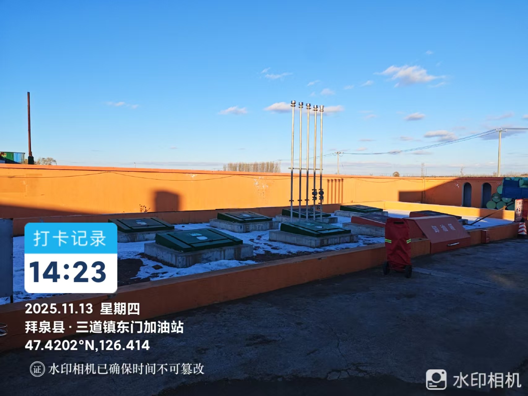 拜泉县神峰加油城位于黑龙江省齐齐哈尔市拜泉县三道镇所在地,加油站共有宗地面积为1552.95m2,站区东侧、西侧、北侧设置站内外地坪高度不低于2.2m,不燃烧体实体围墙。在站区南侧设置加油站出入口,出入口与正大街相连。 加油站汽油(柴油)工艺设备与站外建(构)筑物安全间距满足《汽车加油加气加氢站技术标准》(GB50156-2021)第4.0.4条的要求,加油站设实体围墙,周围50m范围内没有重要公共建筑。 加油站设有非承重式罐区一处,内设4座卧式双层SF埋地储油罐,储油品种为乙醇汽油、柴油,加油区设自吸式税控加油机2台,潜油泵式税控加油机2台,潜油泵式双枪单油品柴油加油机2台(东南侧潜油泵式双枪单油品柴油加油机暂停使用)。该加油站已设有分散式汽油加油油气回收系统和汽油卸油油气回收系统。加油站未设自助加油机。 经计算该加油站储油罐总容积为125m3(柴油减半),依据《汽车加油加气加氢站技术标准》(GB50156-2021)第3.0.9条加油站等级划分的规定,属于二级加油站。 |
